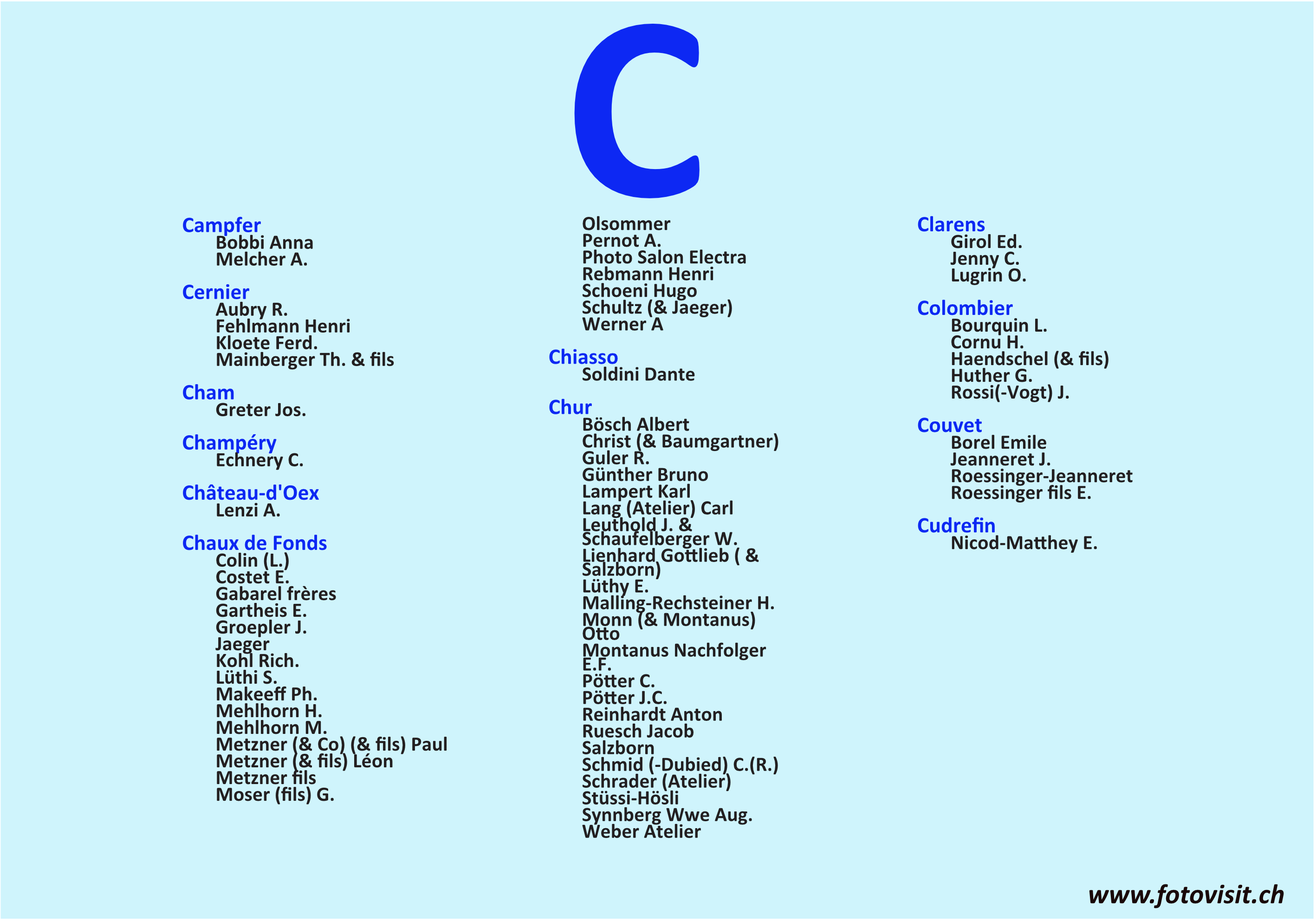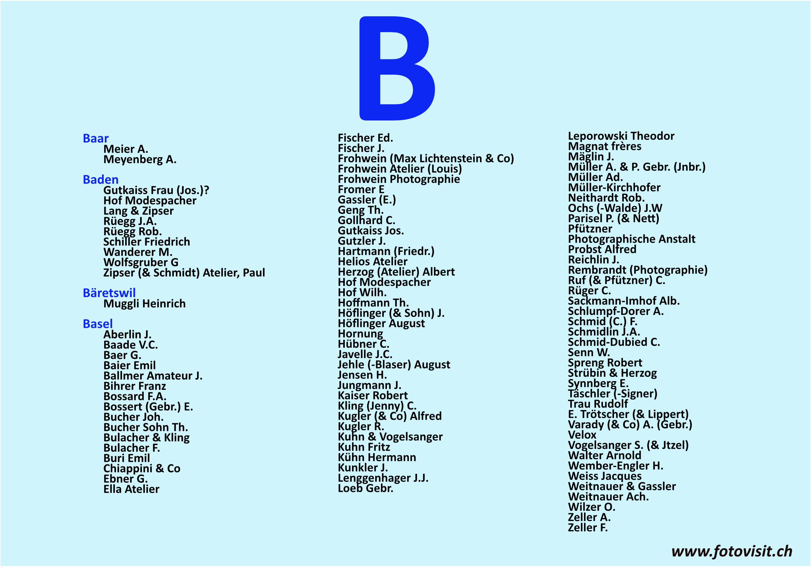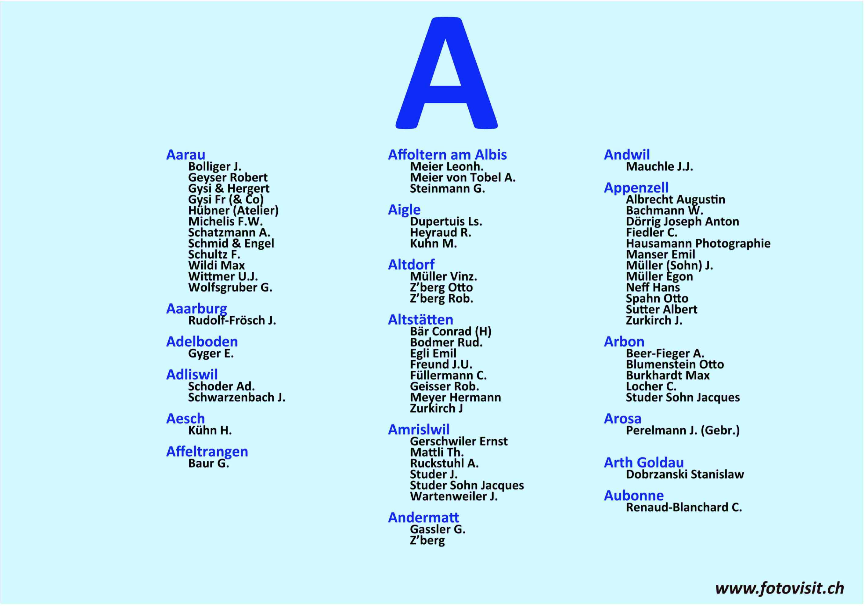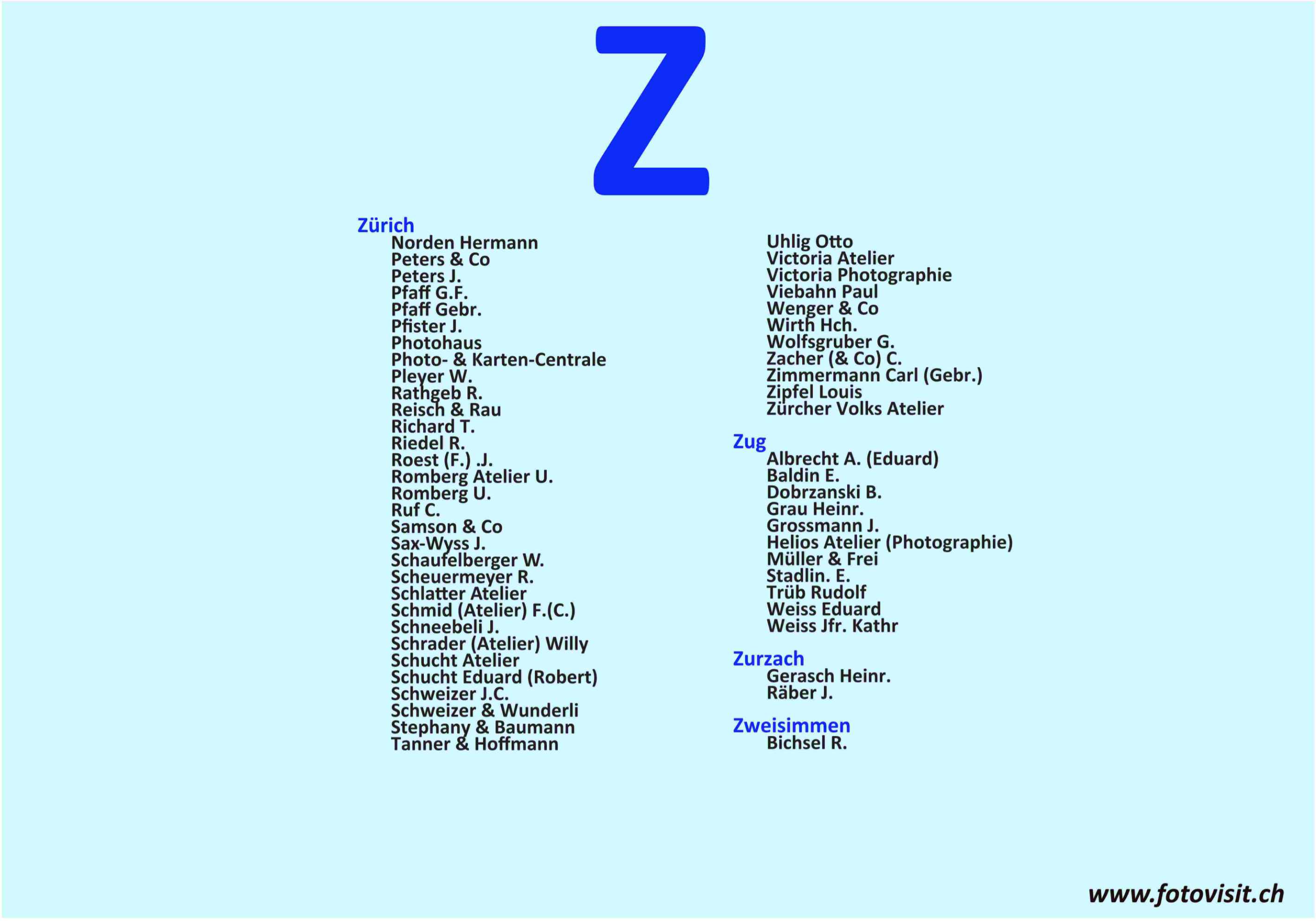 This list of over 1'500 CdV photographers who were active in Switzerland between 1860 and 1925, is not yet complete. It is based on my collection. Some CdVs of photographers are harder to find because they were probably only briefly active and many CdVs of them have been already lost. Most were studio photographers, some of them were specialized in landscape photography or just had a branch in Switzerland.