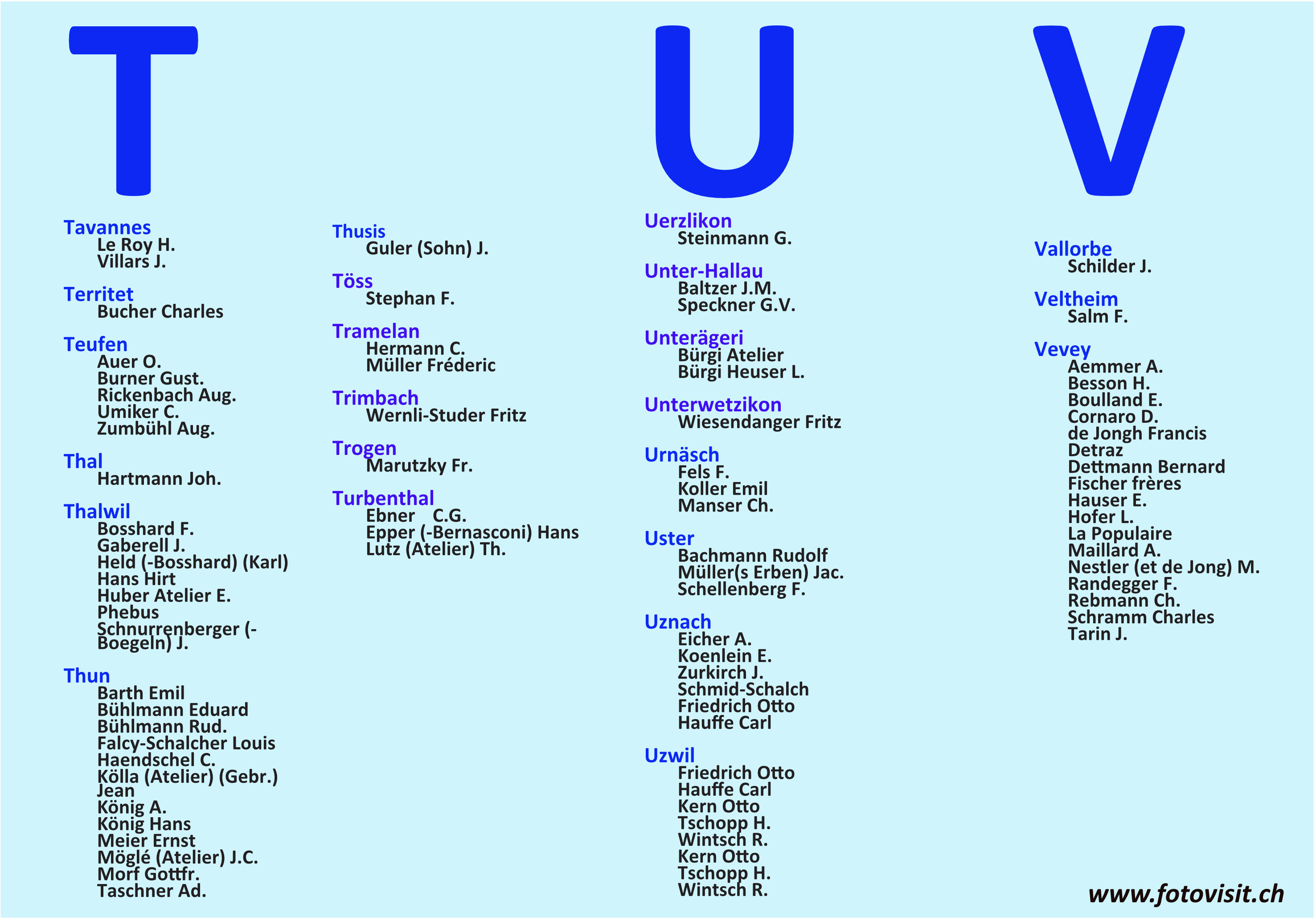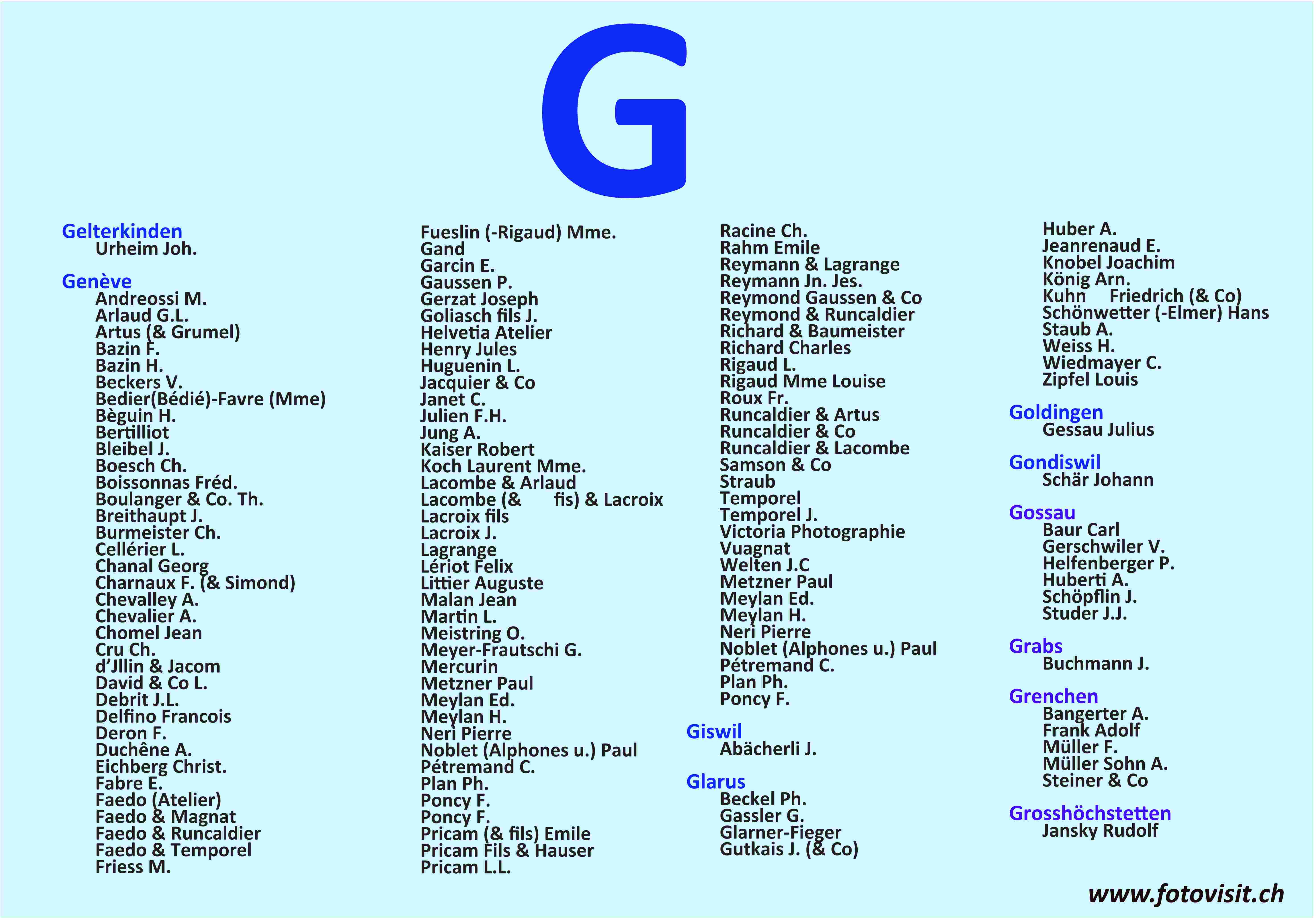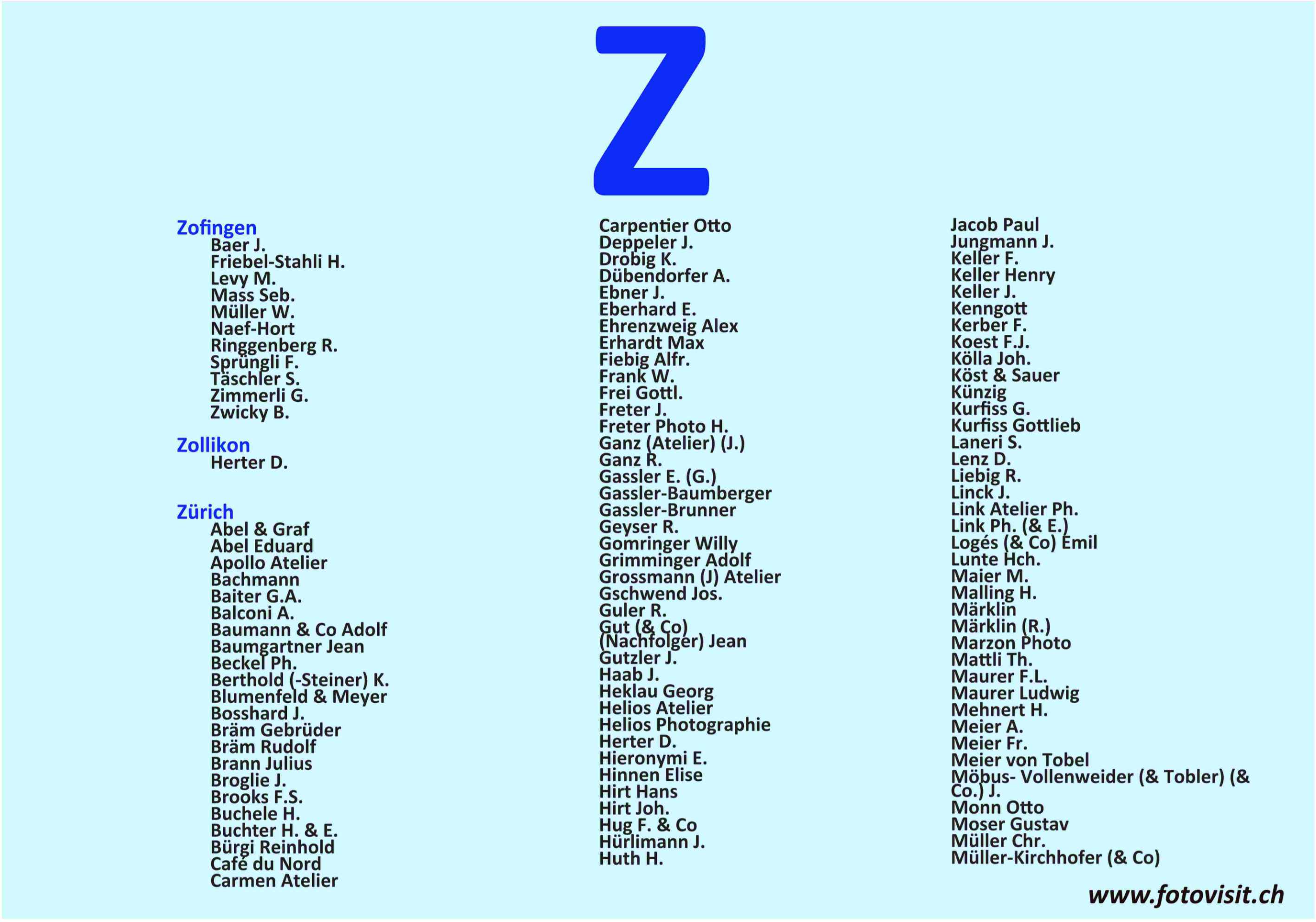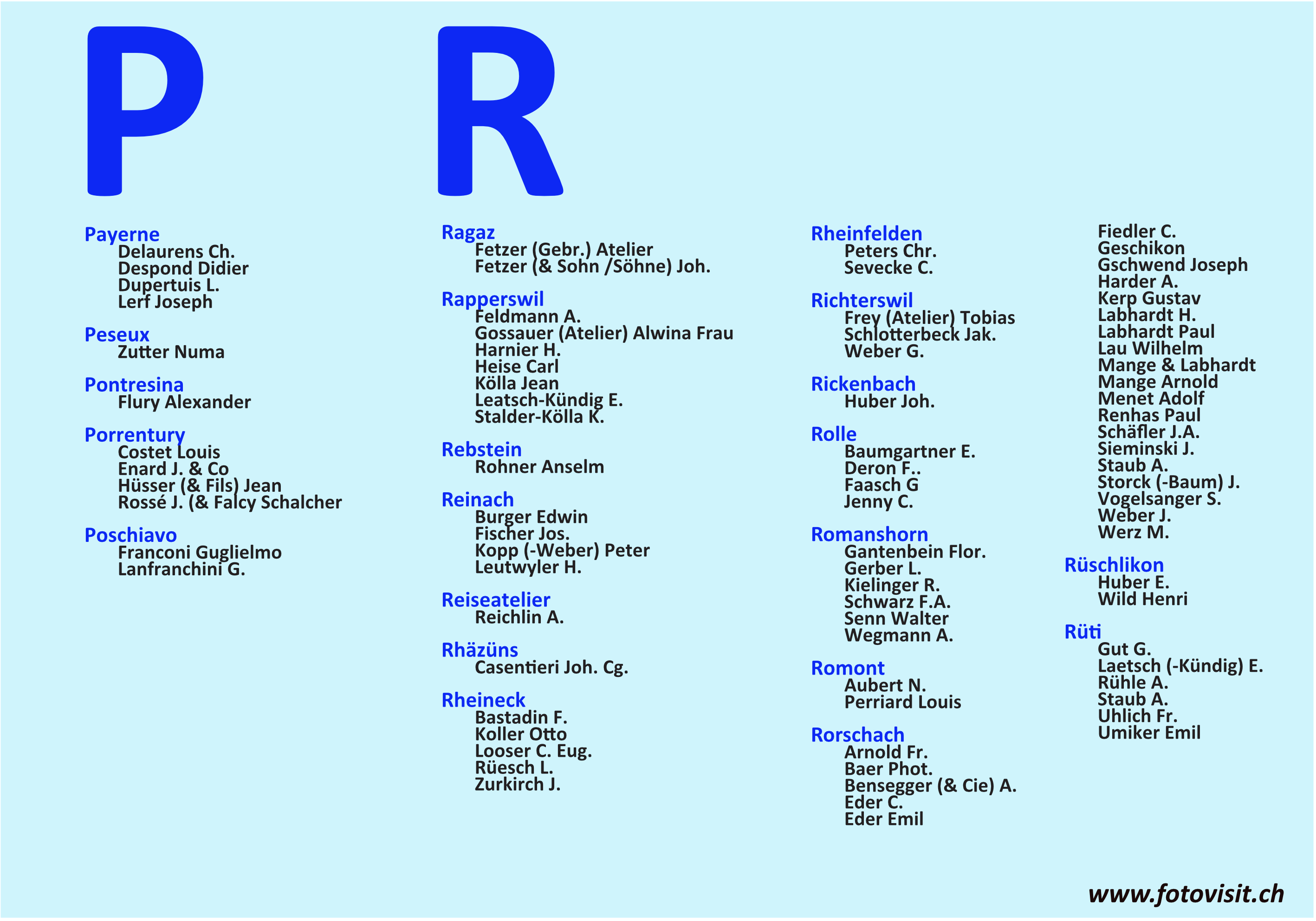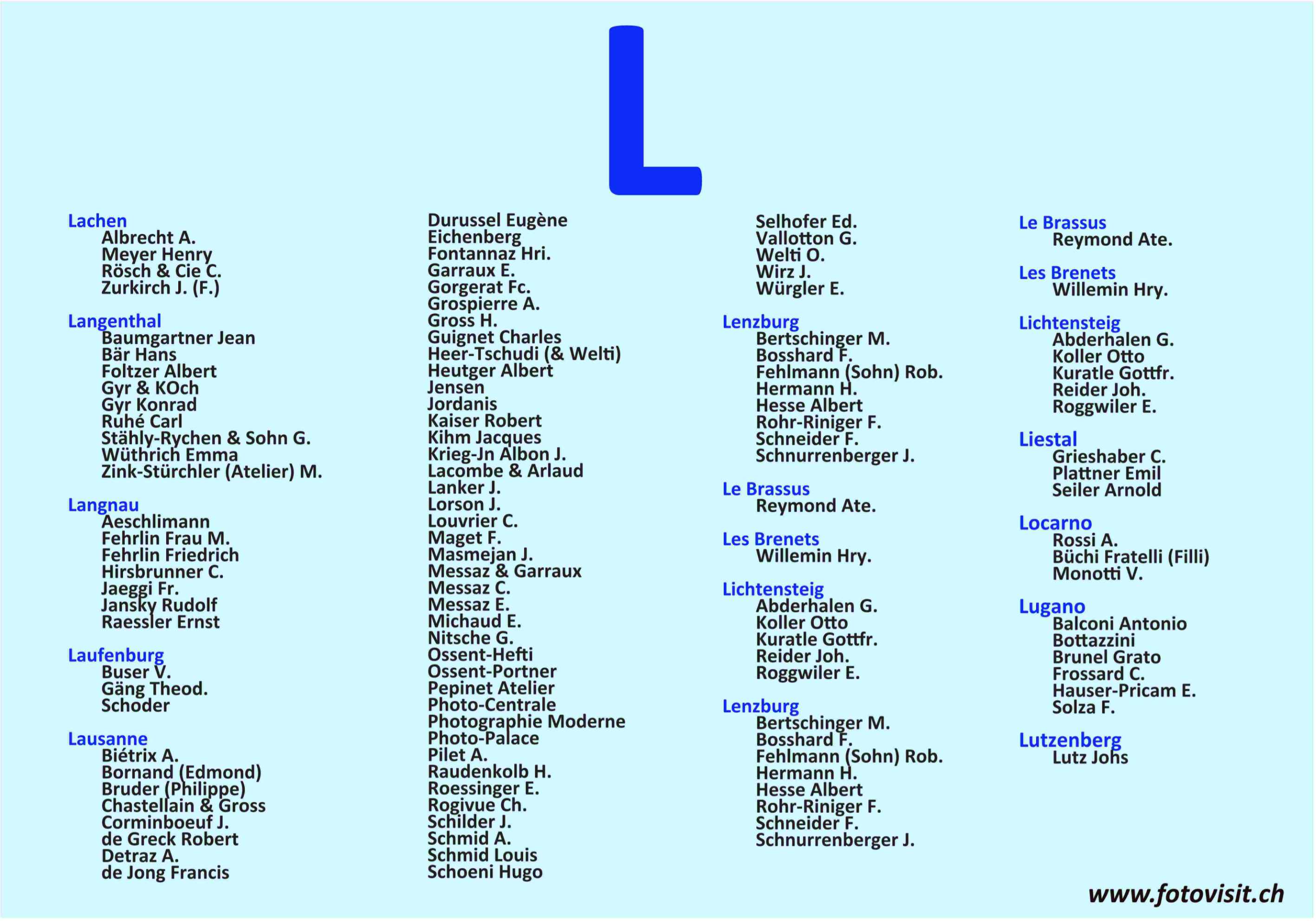 This list of over 1'500 CdV photographers who were active in Switzerland between 1860 and 1925, is not yet complete. It is based on my collection. Some CdVs of photographers are harder to find because they were probably only briefly active and many CdVs of them have been already lost. Most were studio photographers, some of them were specialized in landscape photography or just had a branch in Switzerland.