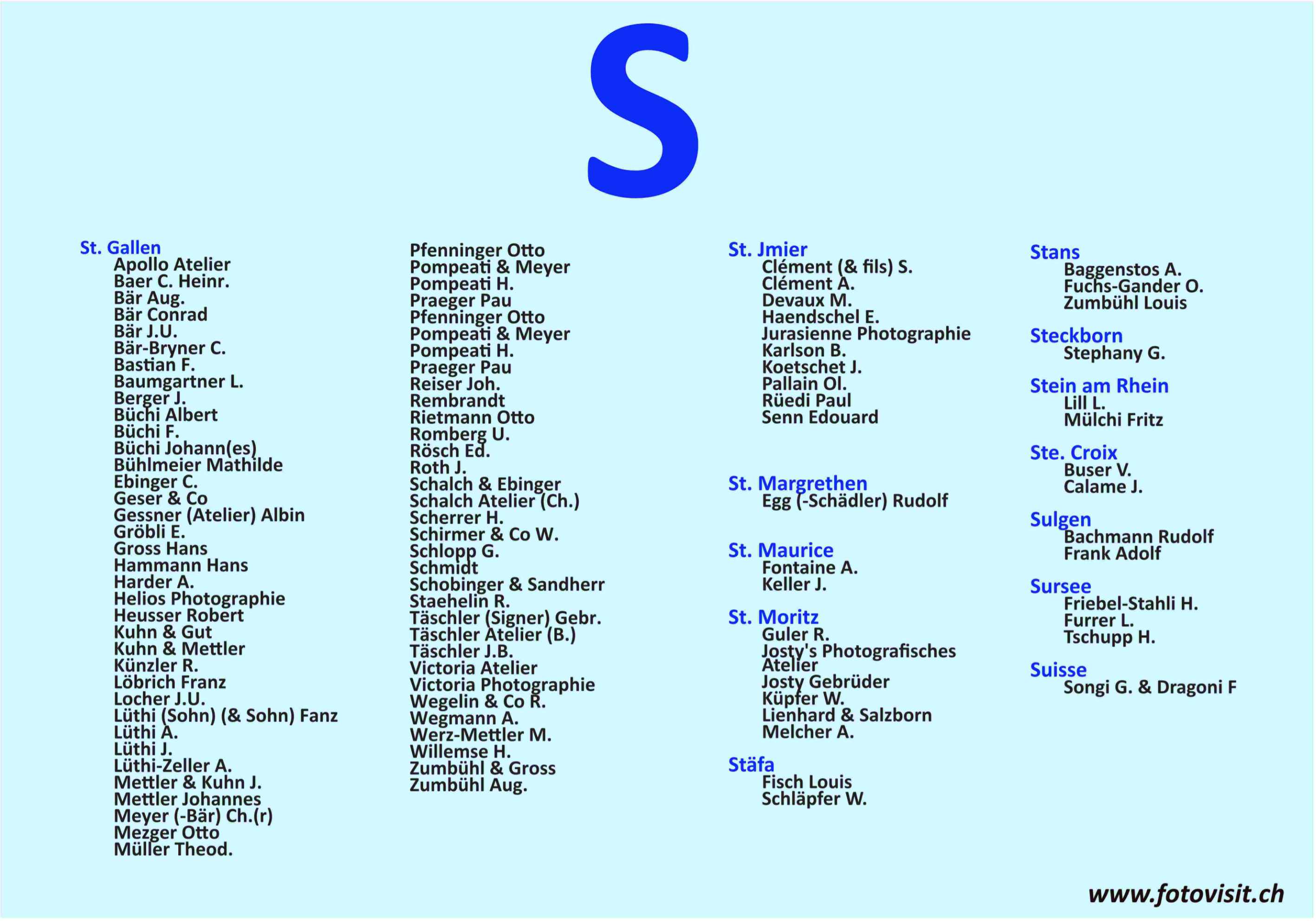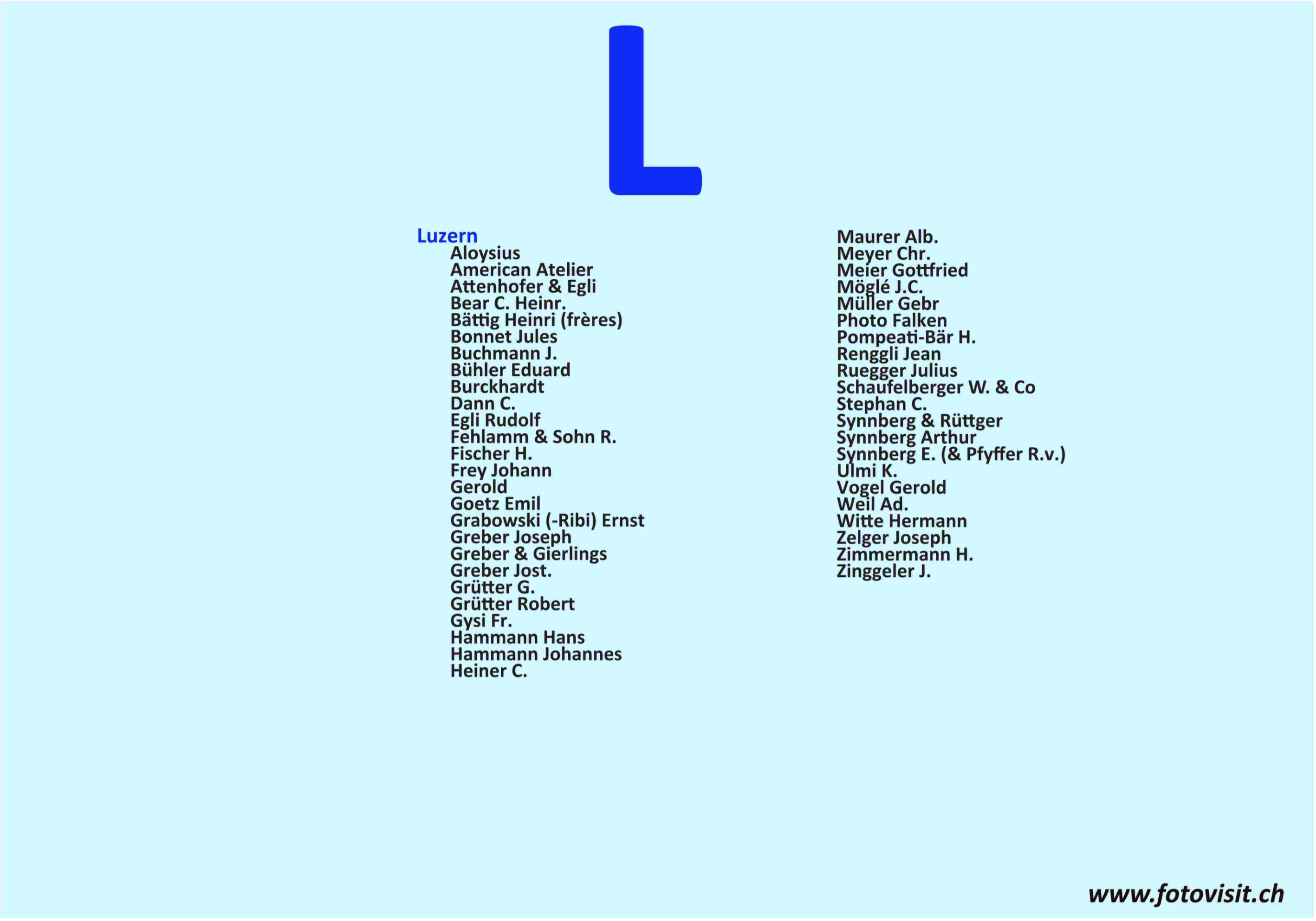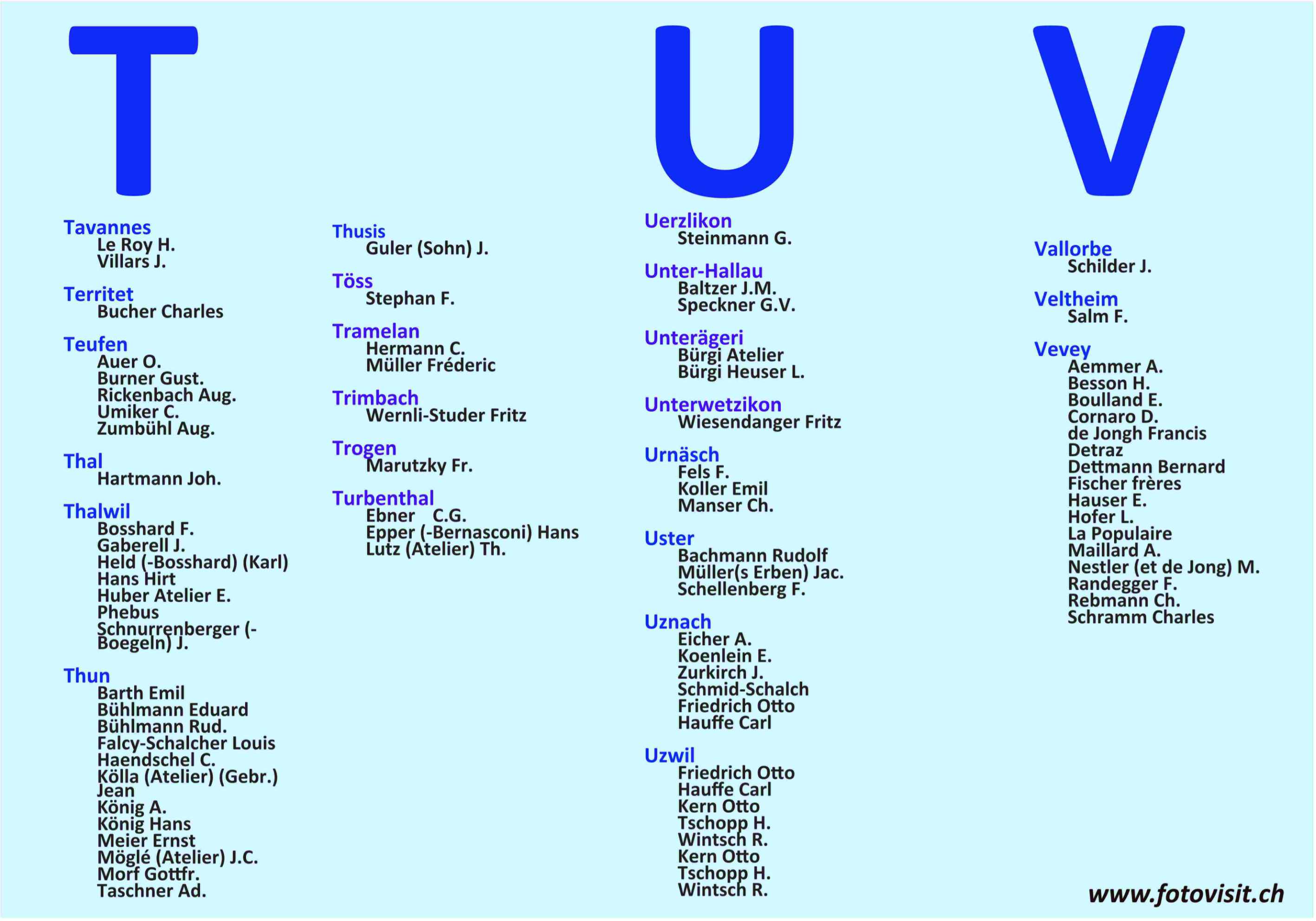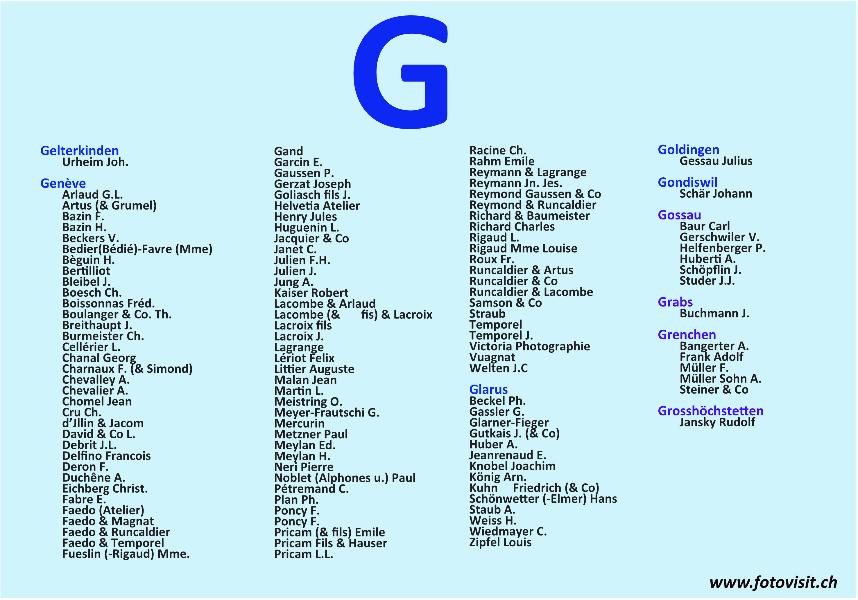 This list of over 1'500 CdV photographers who were active in Switzerland between 1860 and 1925, is not yet complete. It is based on my collection. Some CdVs of photographers are harder to find because they were probably only briefly active and many CdVs of them have been already lost. Most were studio photographers, some of them were specialized in landscape photography or just had a branch in Switzerland.