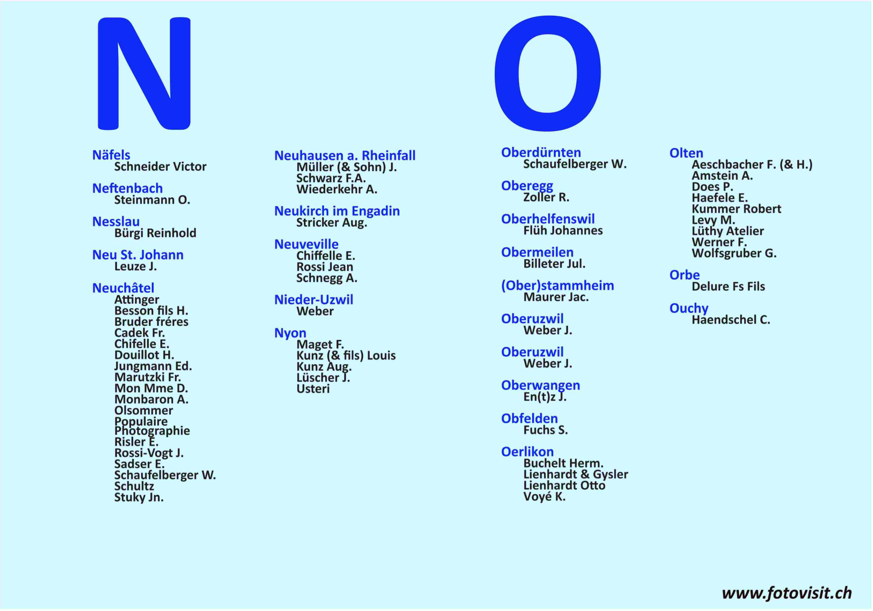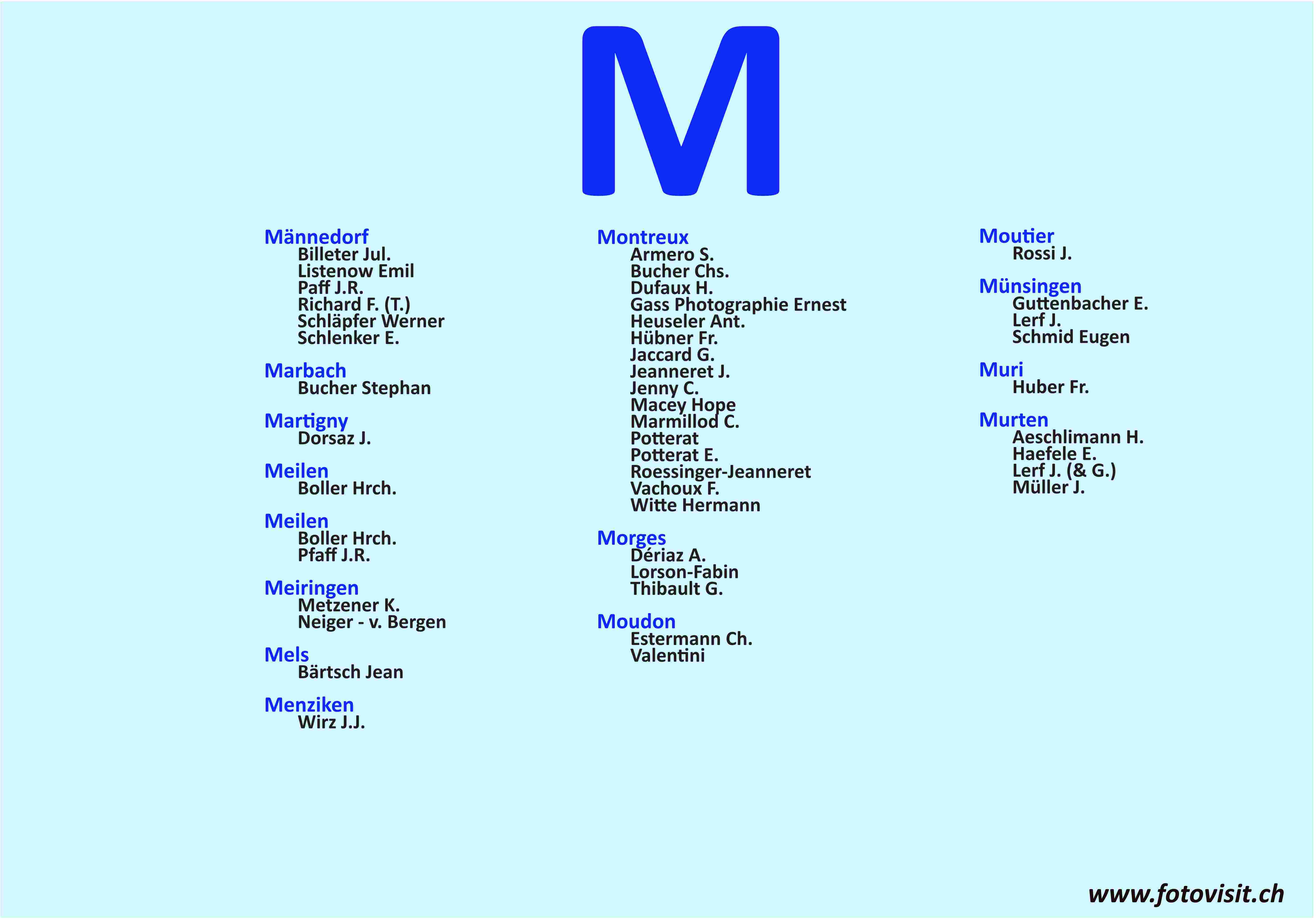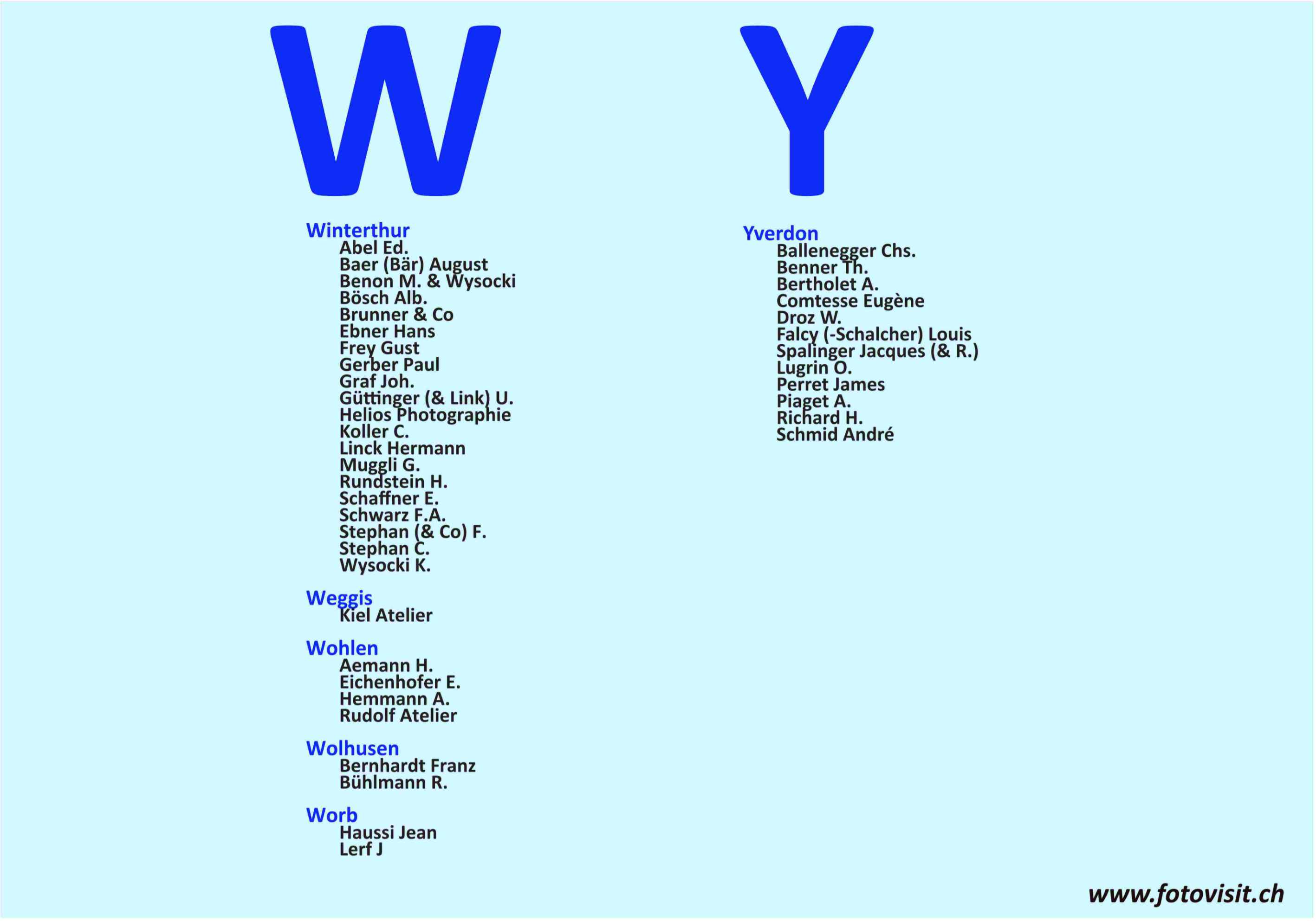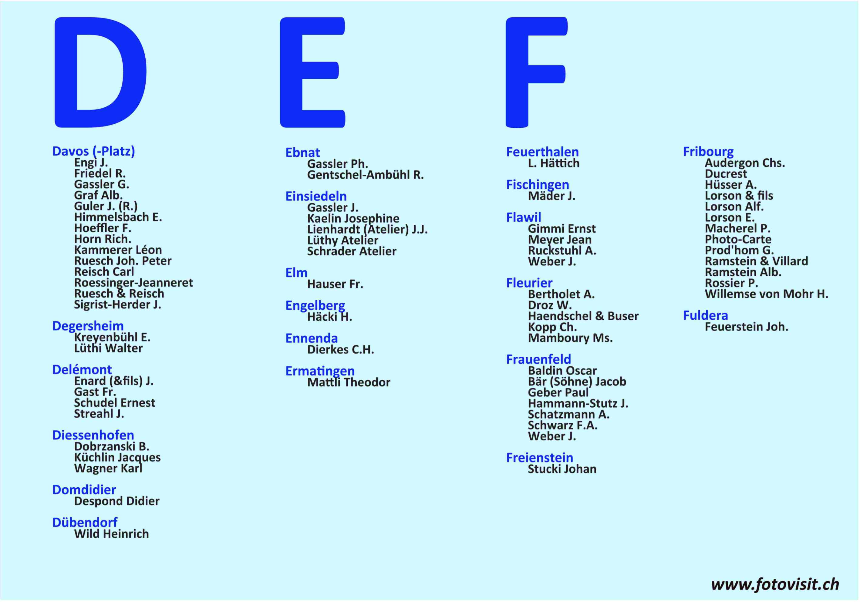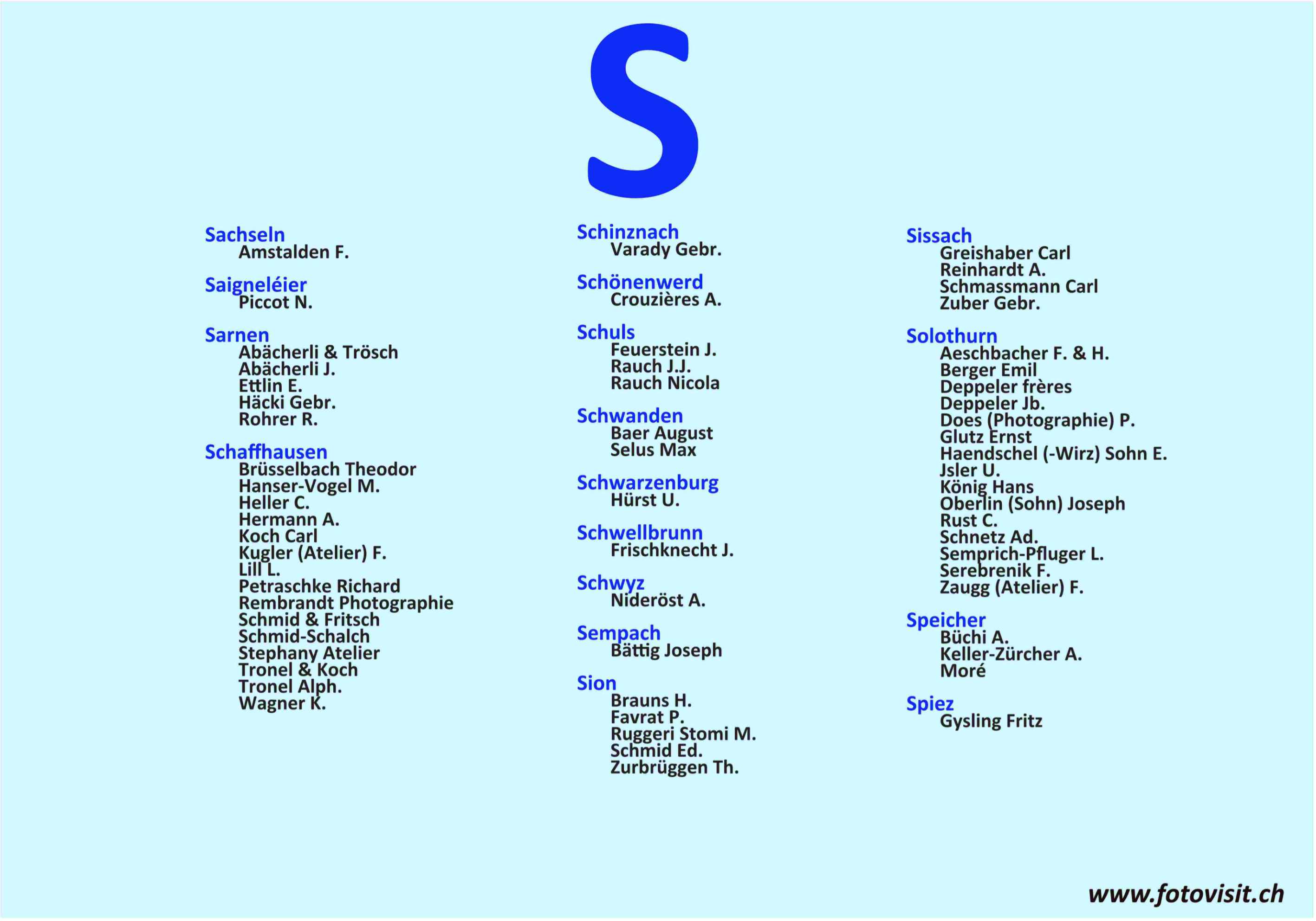 This list of over 1'500 CdV photographers who were active in Switzerland between 1860 and 1925, is not yet complete. It is based on my collection. Some CdVs of photographers are harder to find because they were probably only briefly active and many CdVs of them have been already lost. Most were studio photographers, some of them were specialized in landscape photography or just had a branch in Switzerland.