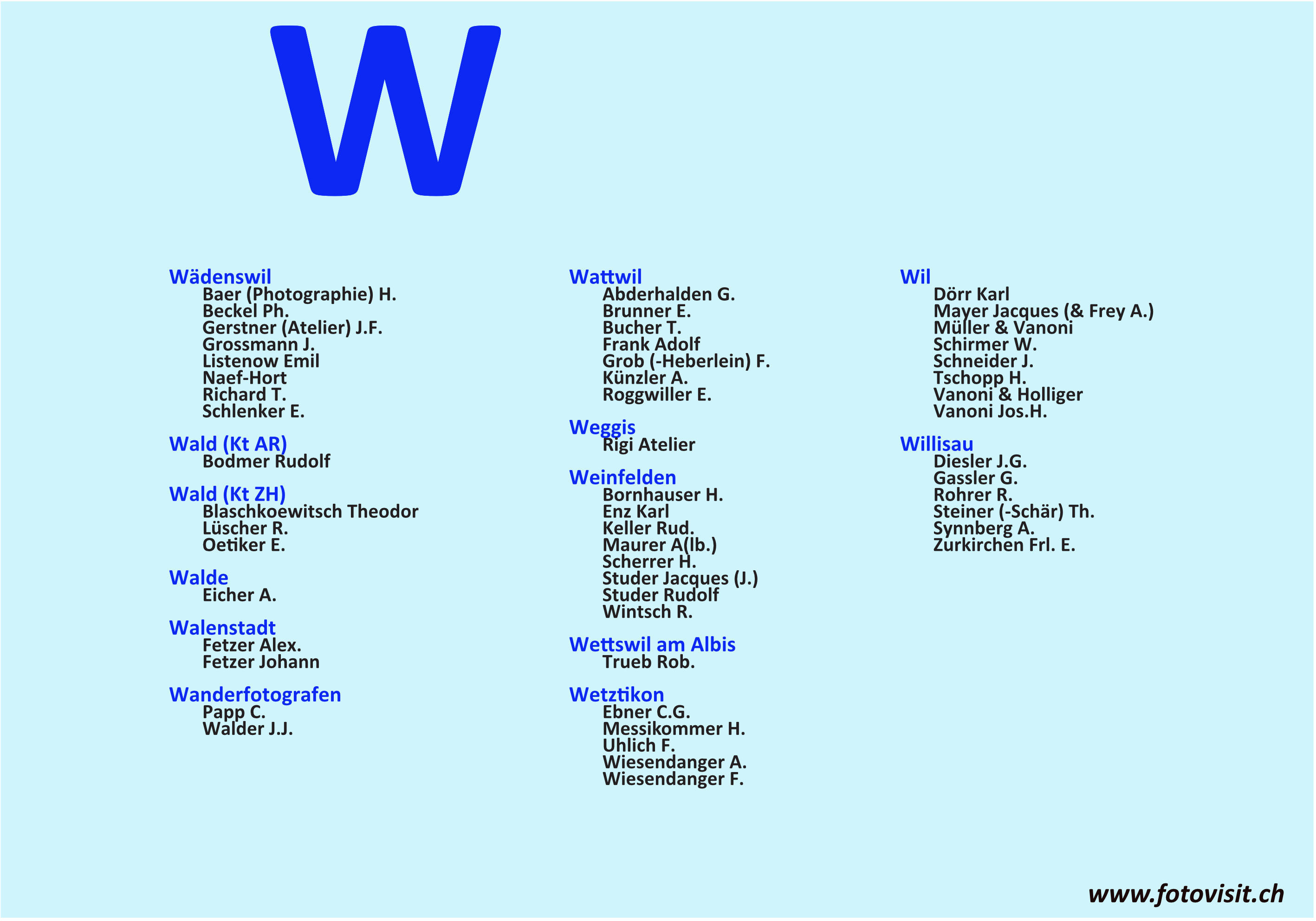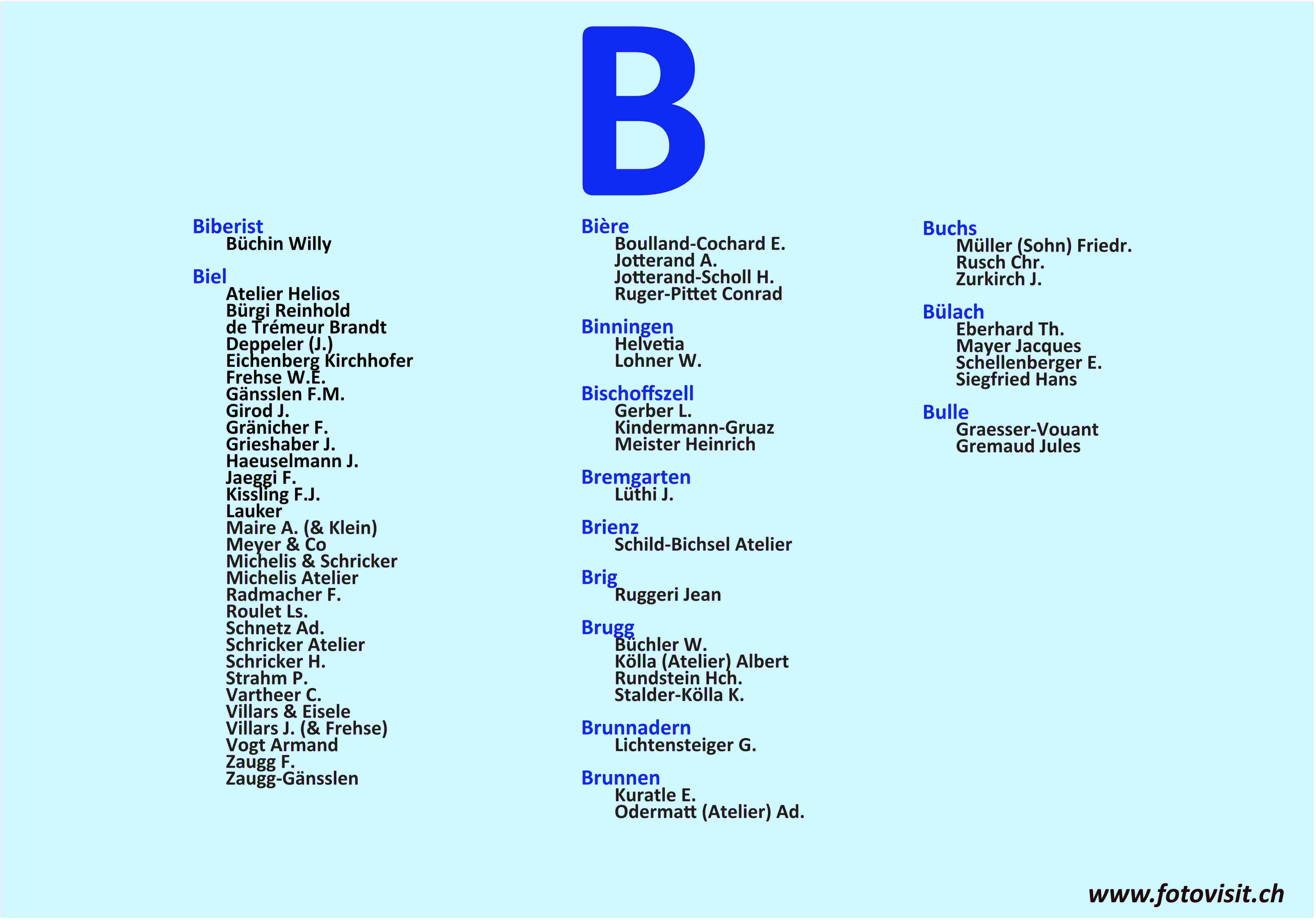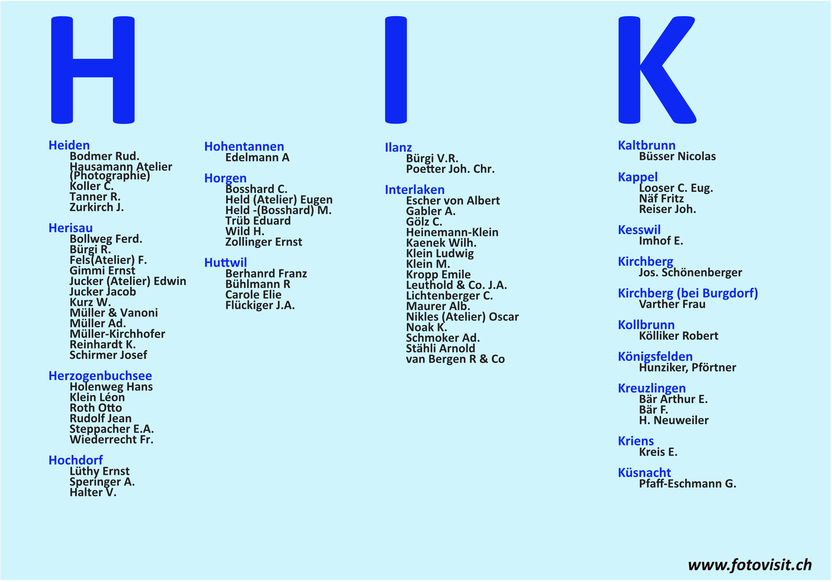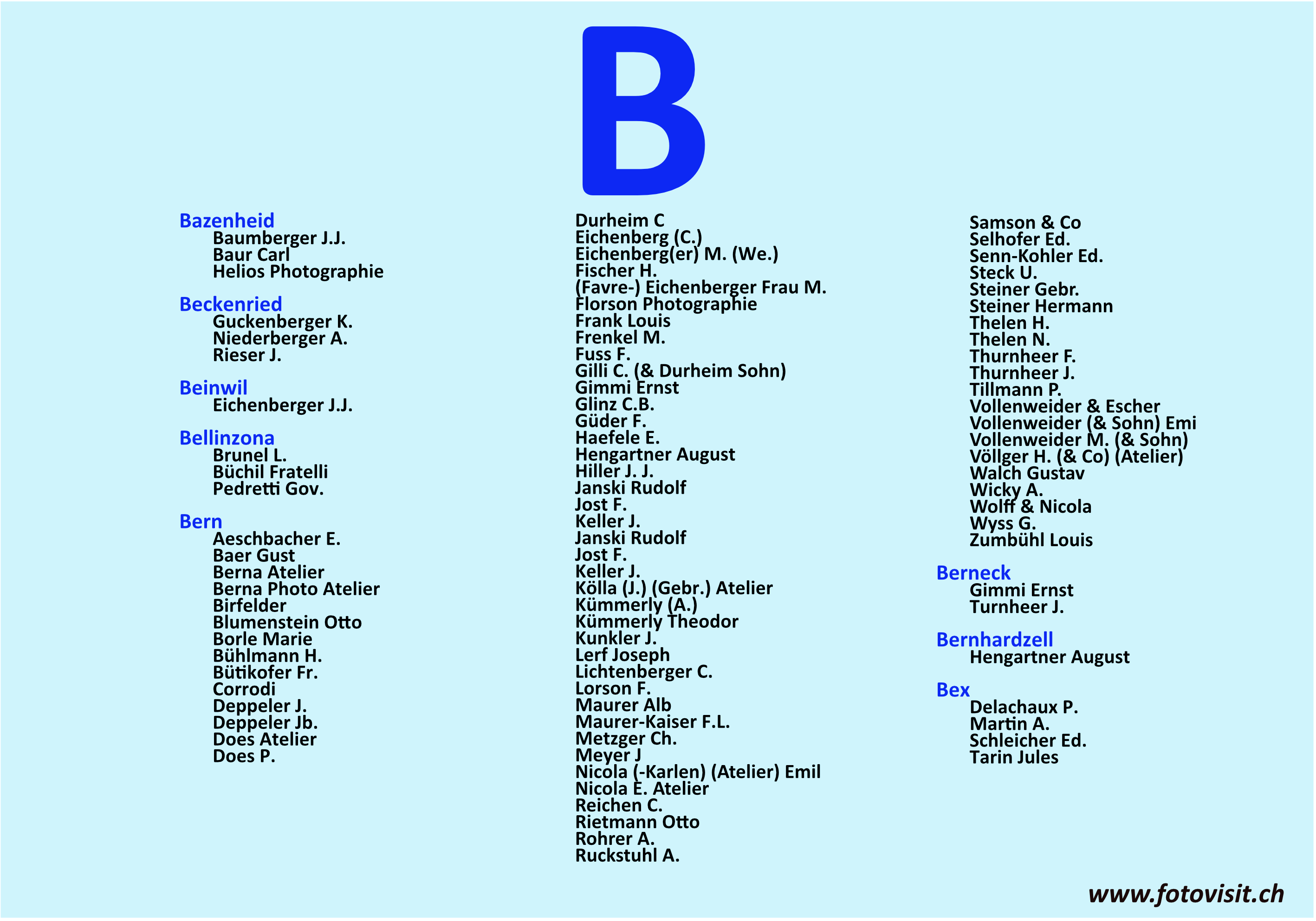 This list of over 1'500 CdV photographers who were active in Switzerland between 1860 and 1925, is not yet complete. It is based on my collection. Some CdVs of photographers are harder to find because they were probably only briefly active and many CdVs of them have been already lost. Most were studio photographers, some of them were specialized in landscape photography or just had a branch in Switzerland.