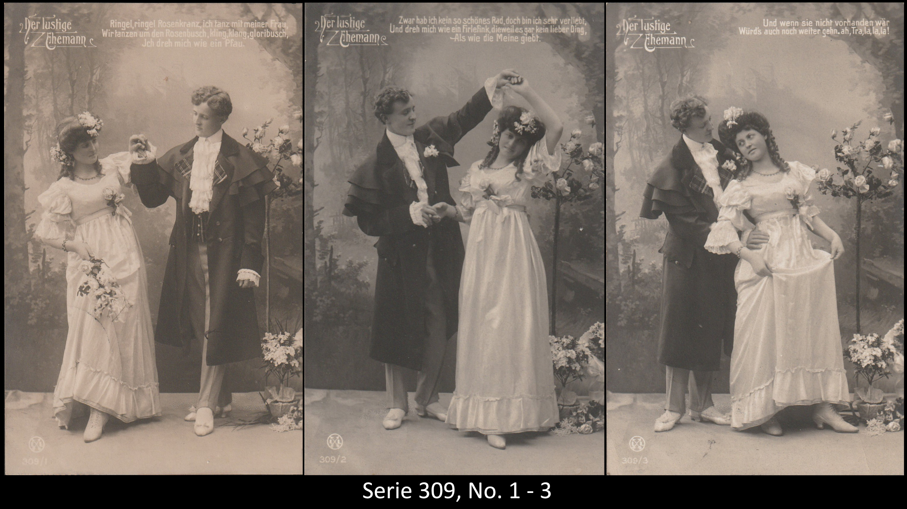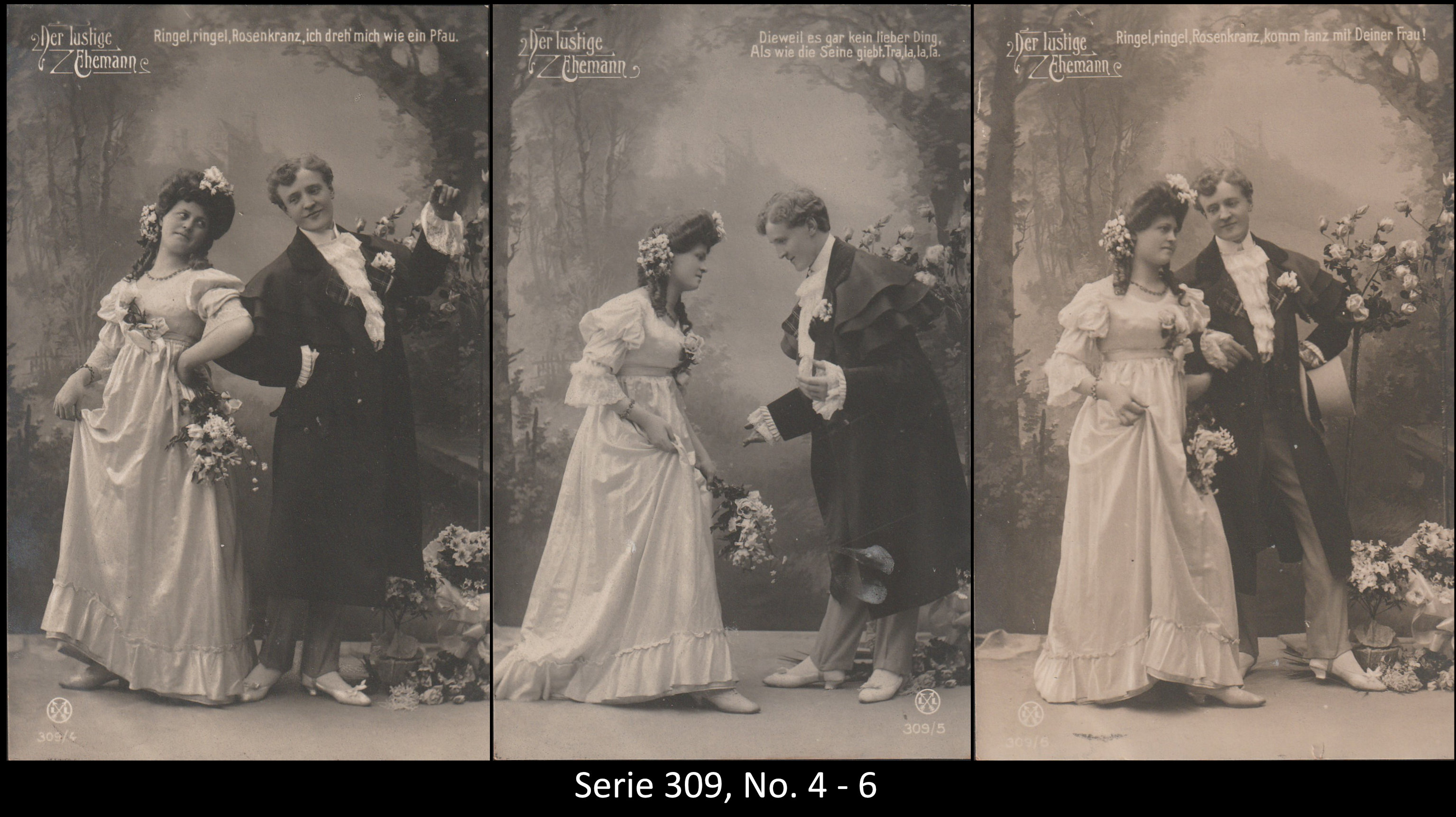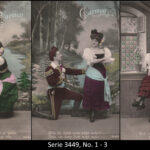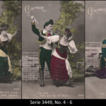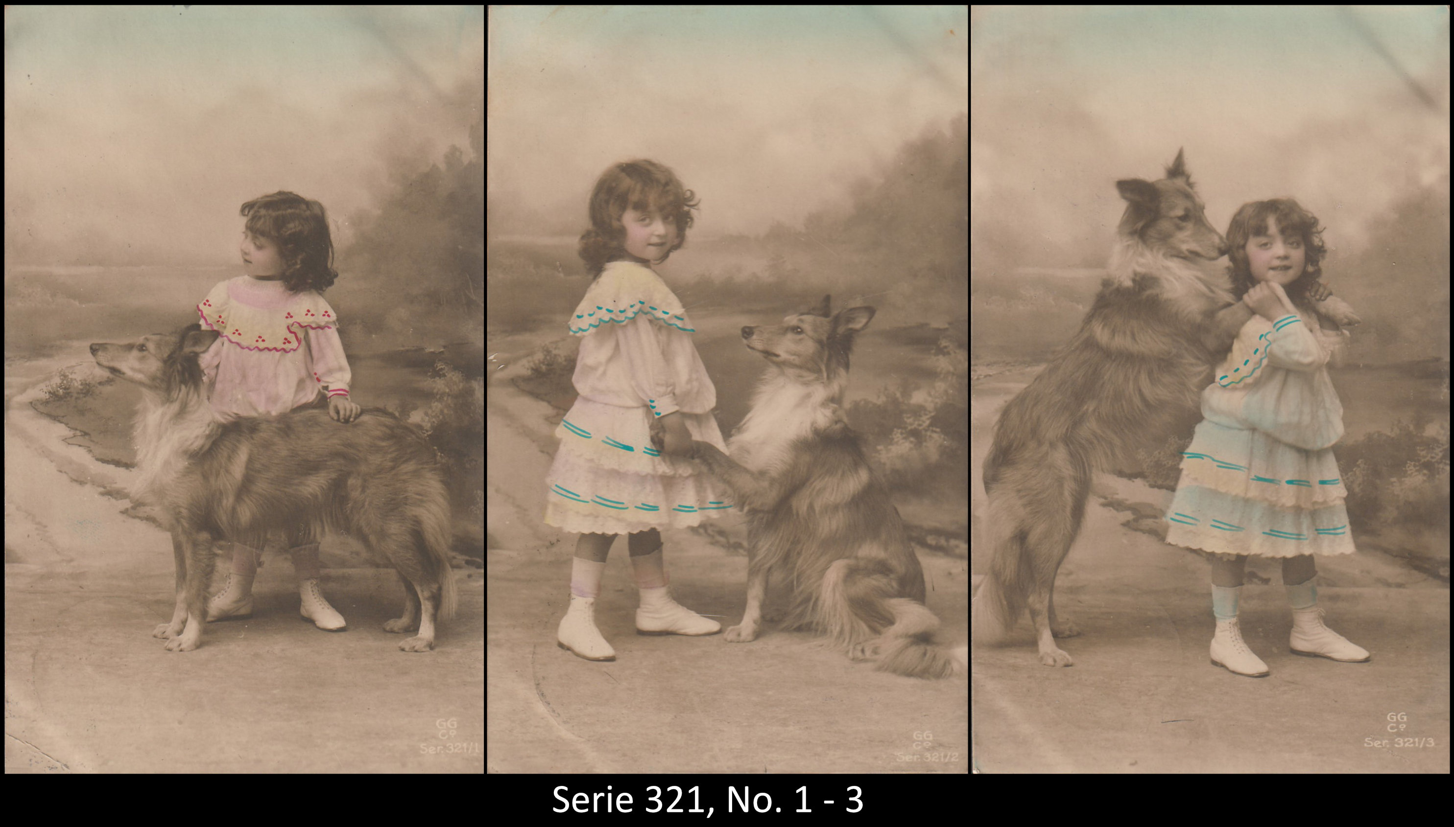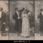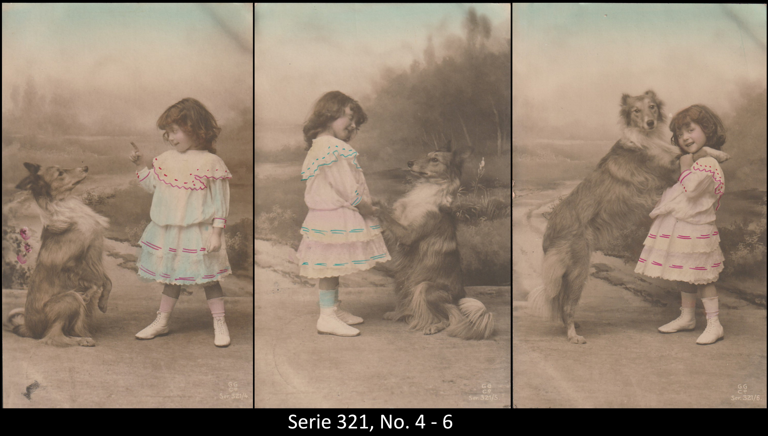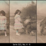 A series consisted mostly of 6 (5, 9 or 12, see gallery) cards which were often sent in succession. Unfortunately, many series are not complete. Almost always the same scene was photographed from different angles. The cards from one series were also colored differenty.The themes are mostly of departure, longing, joy or sorrow.