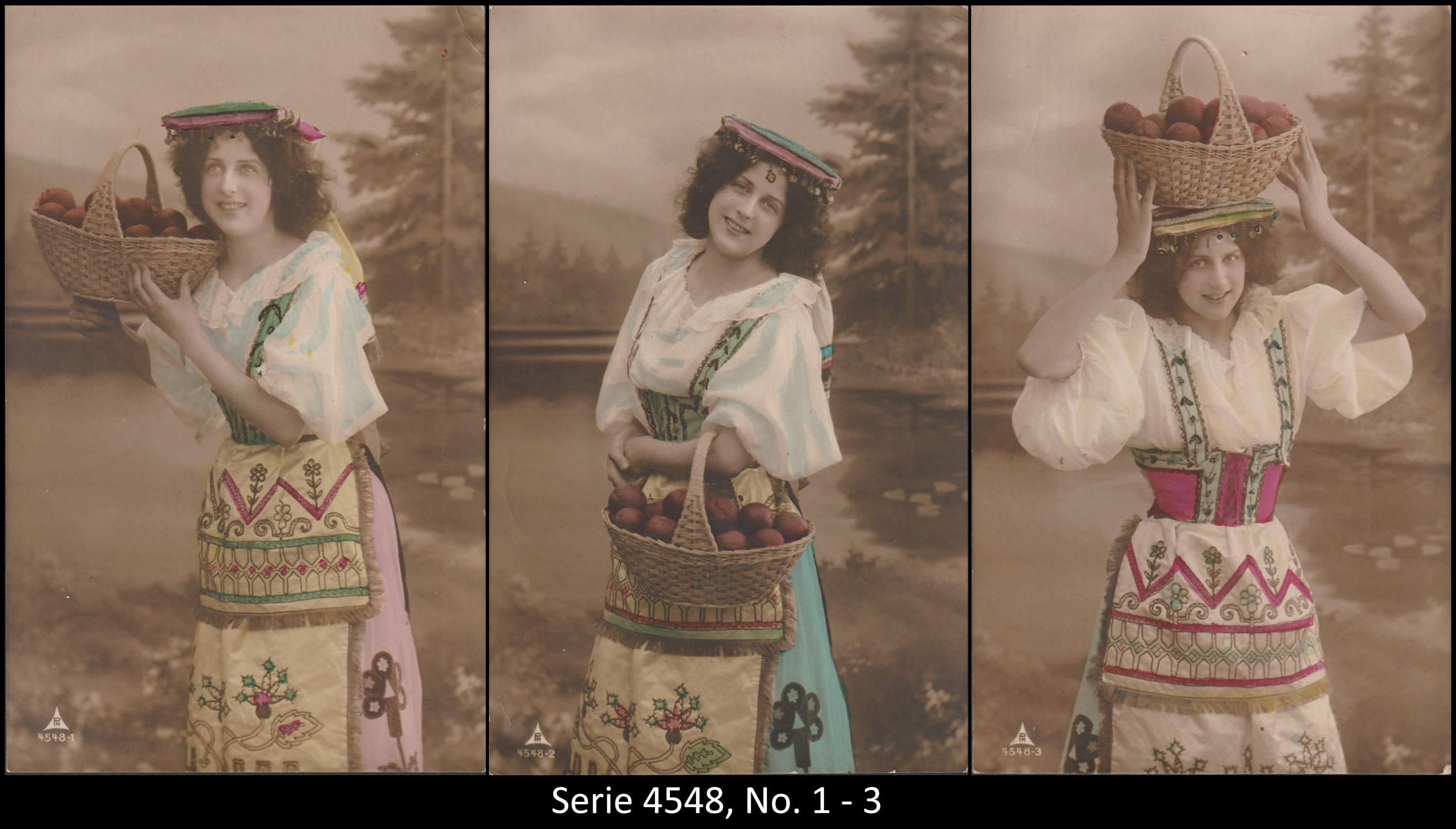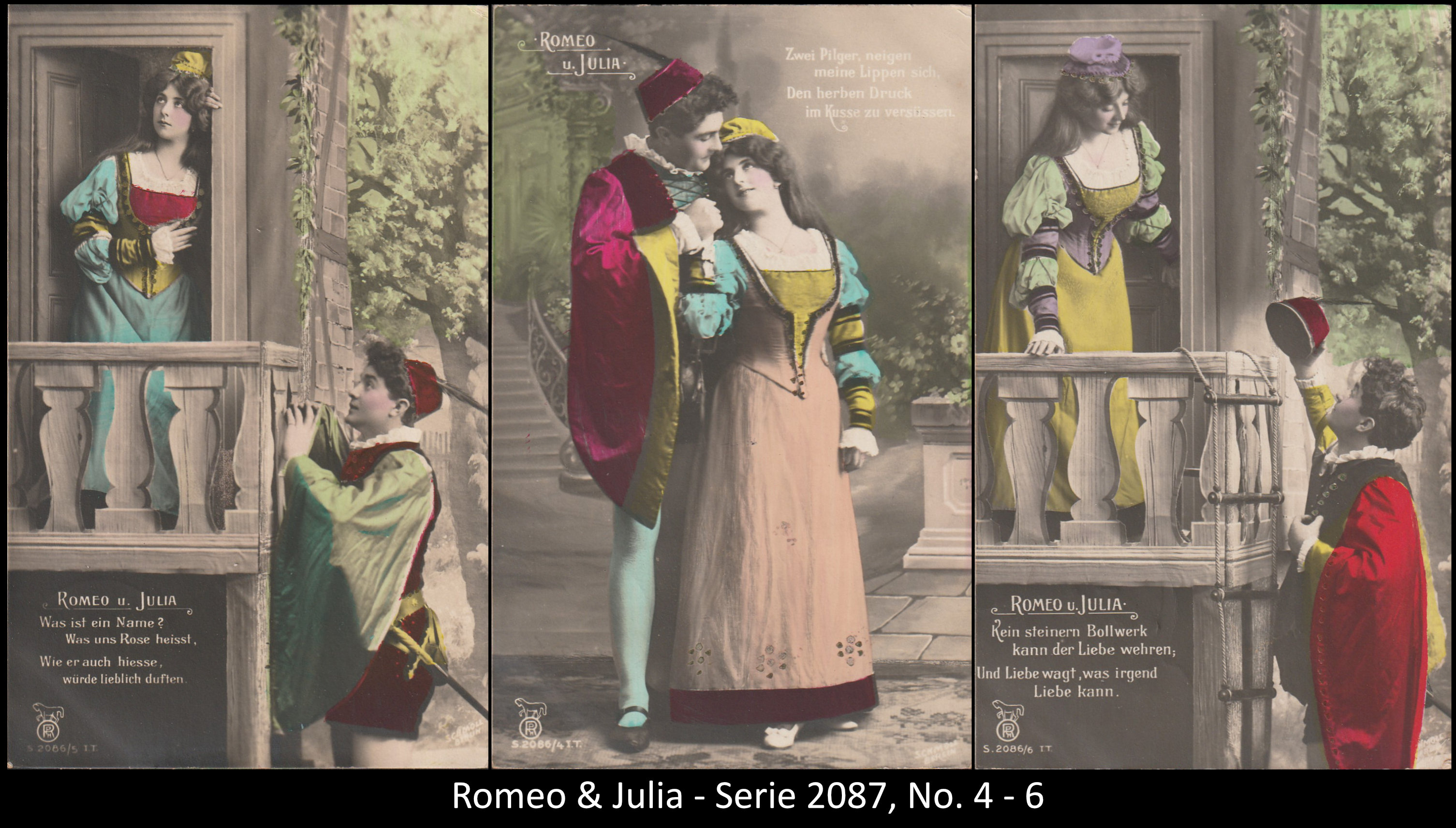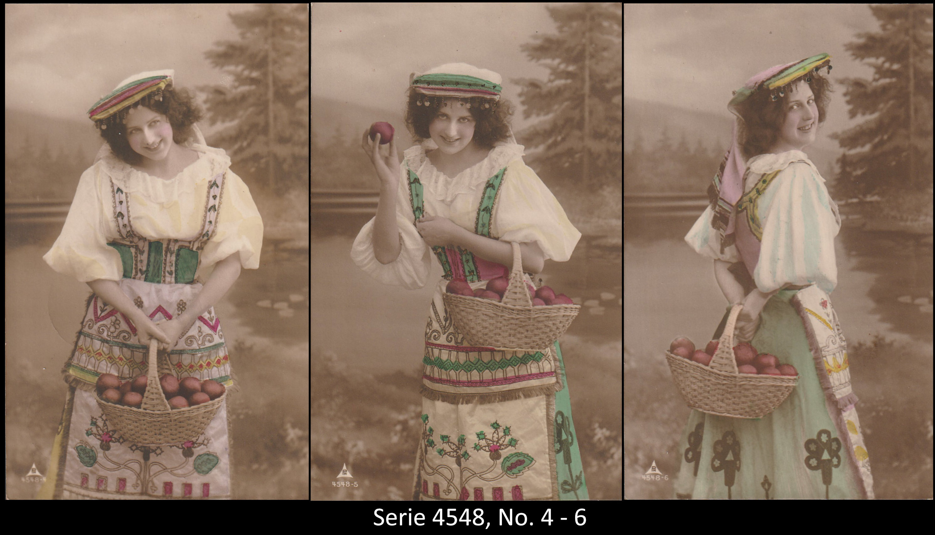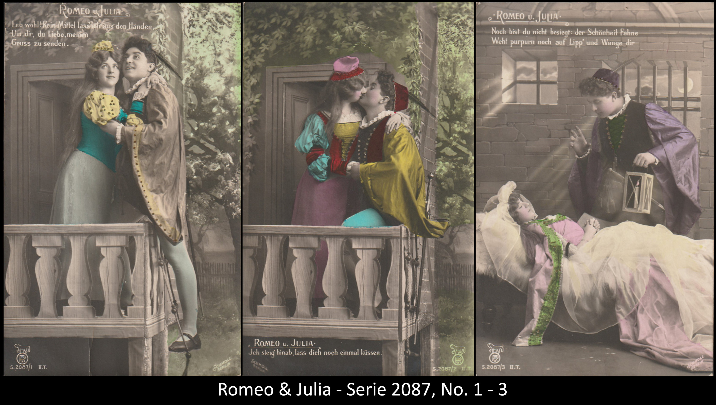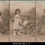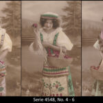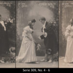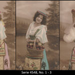 A series consisted mostly of 6 (5, 9 or 12, see gallery) cards which were often sent in succession. Unfortunately, many series are not complete. Almost always the same scene was photographed from different angles. The cards from one series were also colored differenty.The themes are mostly of departure, longing, joy or sorrow.