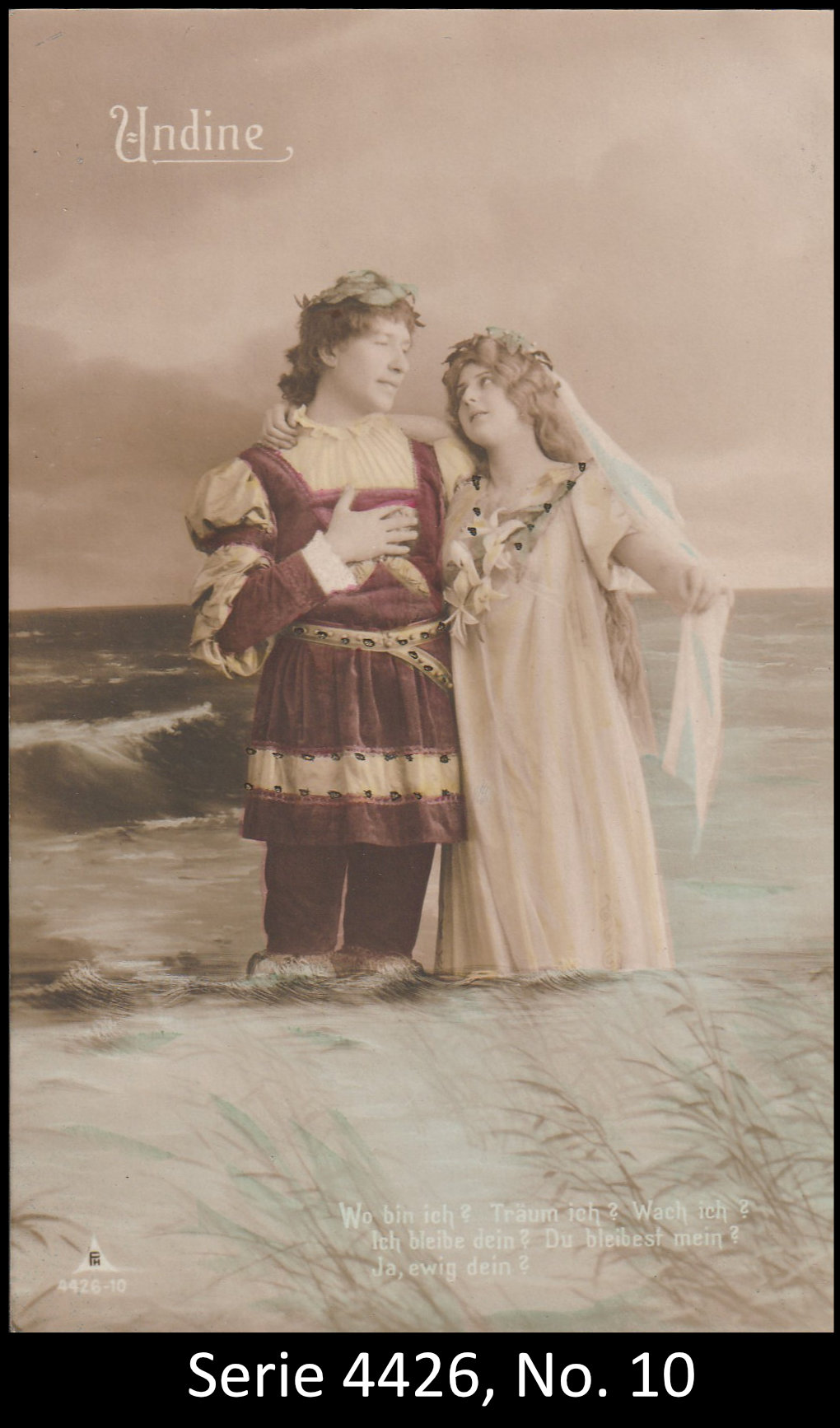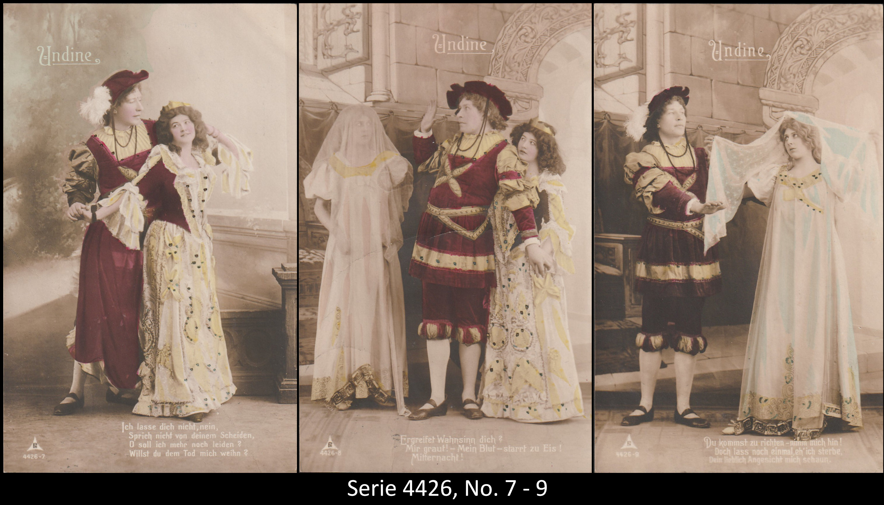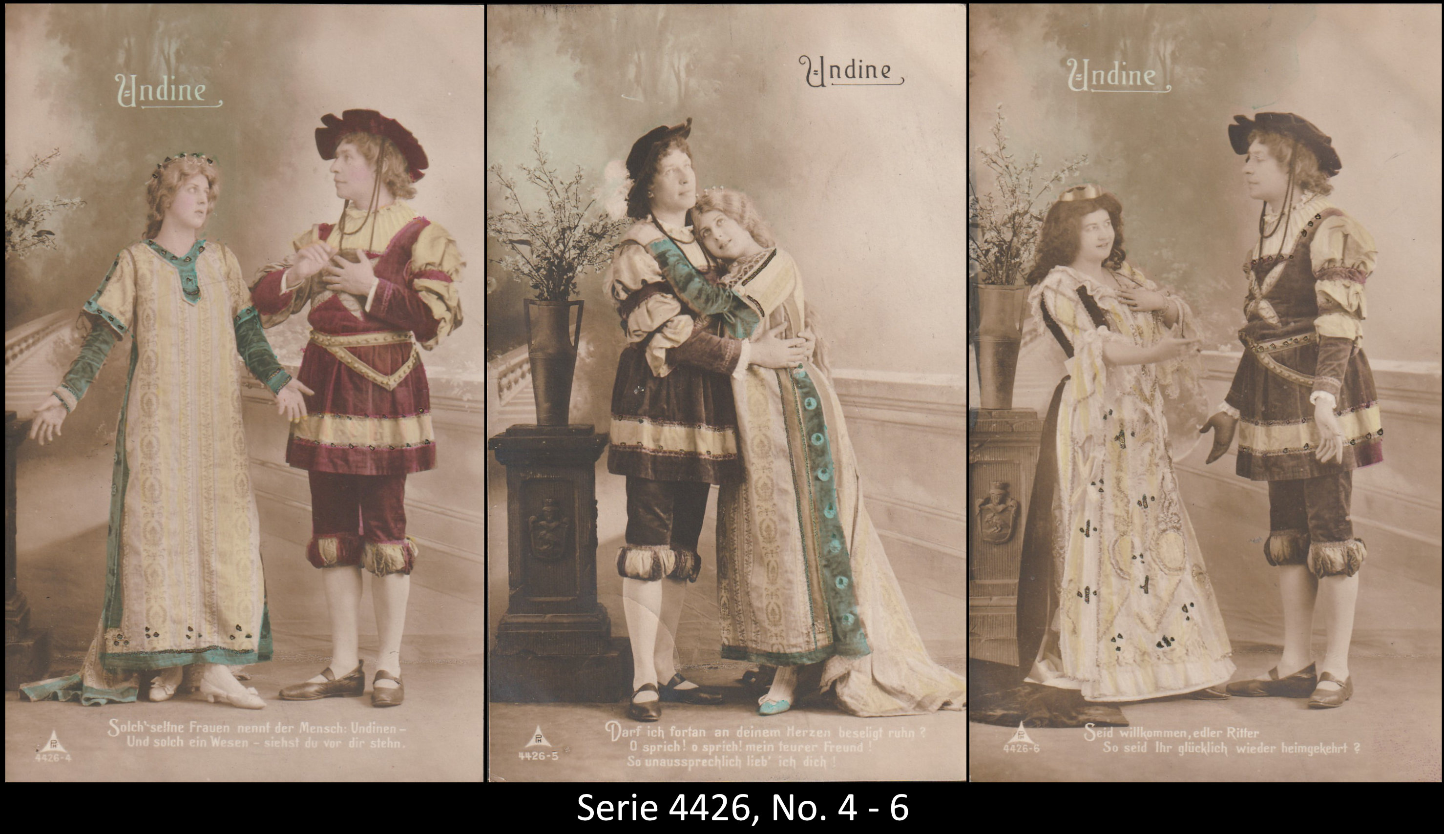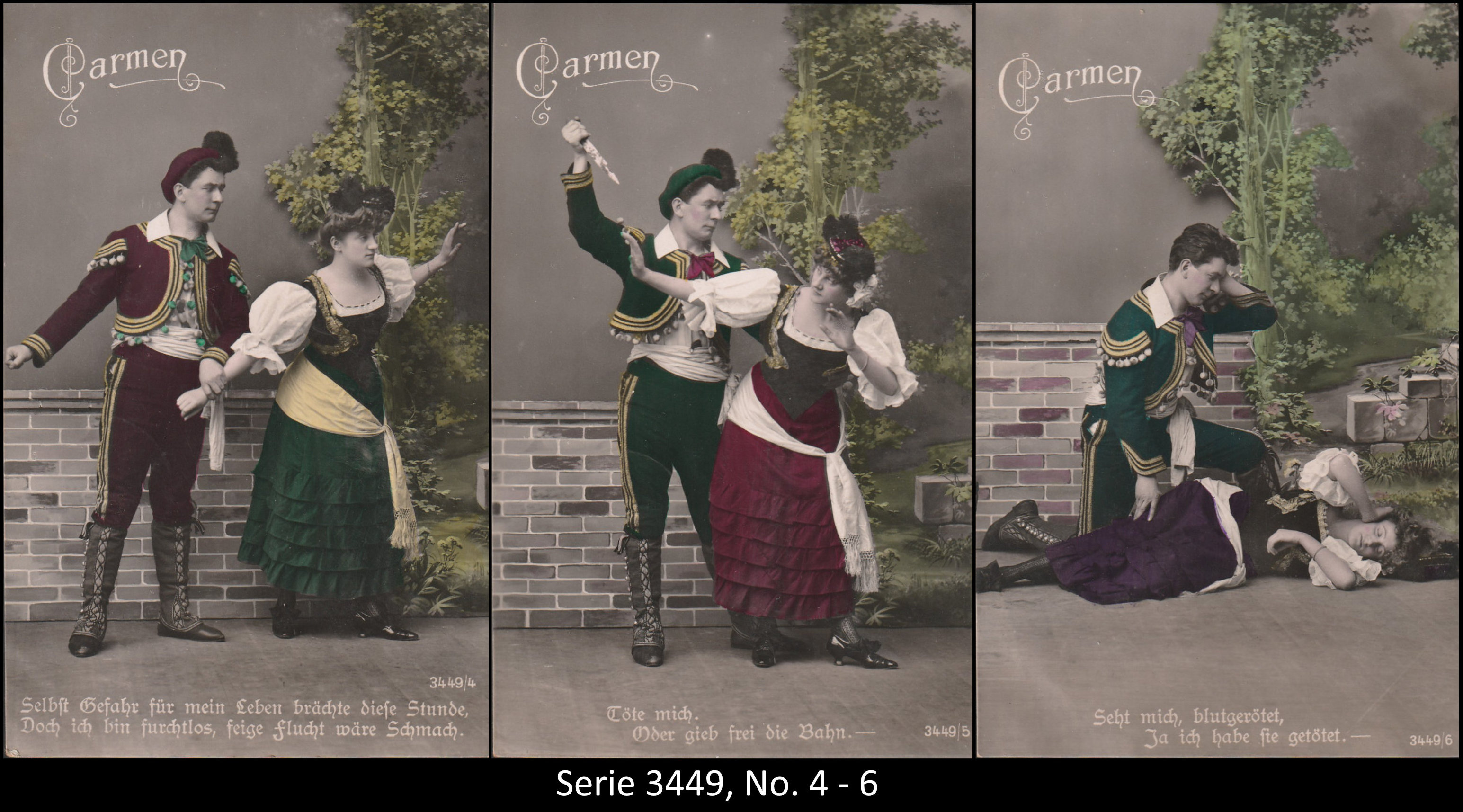 A series consisted mostly of 6 (5, 9 or 12, see gallery) cards which were often sent in succession. Unfortunately, many series are not complete. Almost always the same scene was photographed from different angles. The cards from one series were also colored differenty.The themes are mostly of departure, longing, joy or sorrow.